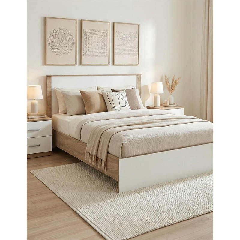 Ανανεώστε τον προσωπικό σας χώρο με ένα σετ κρεβατοκάμαρας που συνδυάζει την απαράμιλλη αισθητική του με τις καθαρές γραμμές του σύγχρονου design. Σχεδιασμένο για να προσφέρει ηρεμία και λειτουργικότητα, το σετ Athos αποτελεί την ιδανική επιλογή για κάθε μοντέρνο σπίτι. Τεχνικά χαρακτηριστικά κρεβατιού: Σταθερός σκελετός από υψηλής ποιότητας μοριοσανίδα με αντοχή στη φθορά και στο χρόνο. Φέρει ξύλινες τάβλες που εφάπτουν ακριβώς στο μέγεθος του κρεβατιού και θα σας προσφέρουν ξεκούραστο ύπνο. Κατάλληλο για στρώμα διαστάσεων 140x200 εκ. (δεν περιλαμβάνεται στη τιμή) Προσφέρεται σε υπέροχη διχρωμία sonoma - λευκό Διαστάσεις προϊόντος: Μήκος: 150 εκ Πλάτος: 206.5 εκ Υψος: 96 εκ Τεχνικά χαρακτηριστικά κομοδίνο: Σταθερός σκελετός από υψηλής ποιότητας μοριοσανίδα με αντοχή στη φθορά και στο χρόνο. Φέρει δύο συρόμενα συρτάρια αποθήκευσης. Προσφέρεται σε μια υπέροχη διχρωμία sonoma- λευκό Διάσταση προϊόντος: Μήκος: 48 εκ. Πλάτος: 40 εκ. Ύψος: 41,5 εκ.
