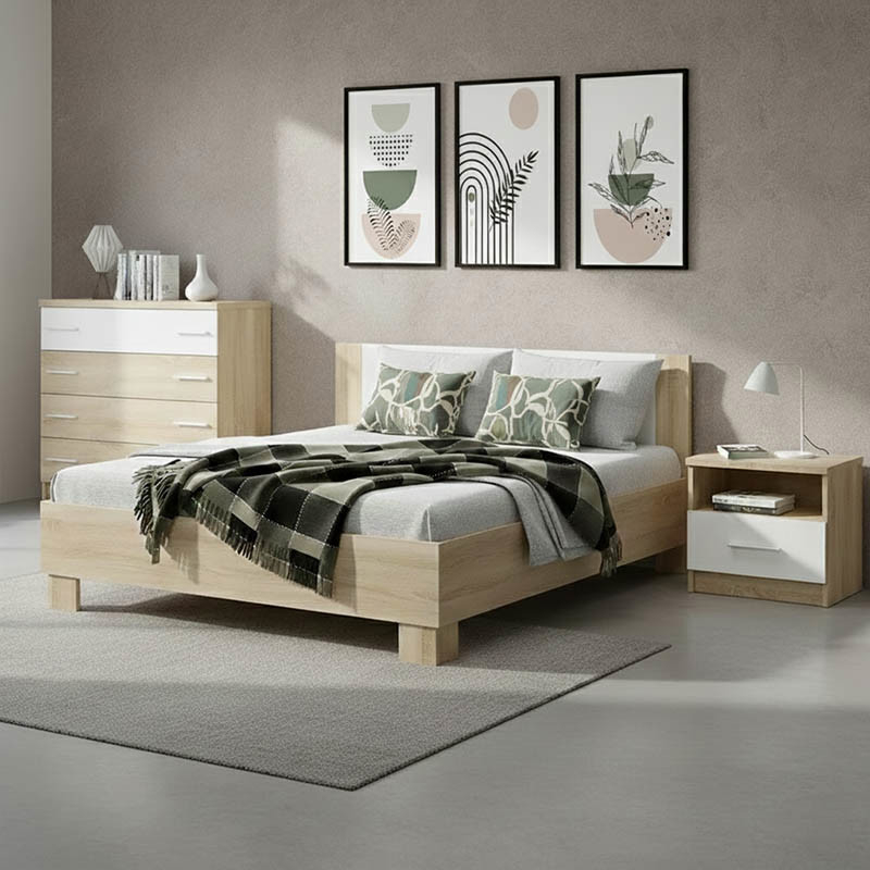 Όλα τα έπιπλα του σετ είναι κατασκευασμένα από μoριοσανίδα με επένδυση μελαμίνης, με αντοχή στην καταπόνηση, την φθορά και τον χρόνο και προσφέρονται σε χρώμα φυσικό-λευκό. Το κρεβάτι συμπεριλαμβάνει ορθοπεδικές τάβλες από ξύλο ειδικά σχεδιασμένες για το κρεβάτι. Ιδανικά συνδυάζεται σε στρώμα πάχους 20/22 εκ. και διαστάσεων 160x200 (δεν συμπεριλαμβάνεται στο κρεβάτι) Η συρταριέρα διαθέτει τέσσερα συρόμενα συρτάρια για κλειστή αποθήκευση των αντικειμένων σας Περιλαμβάνει 2 κομοδίνα τα οποία διαθέτουν ένα συρτάρι για κλειστή αποθήκευση των αντικειμένων σας καθώς και ένα ράφια για ανοιχτή οργάνωση των αξεσουάρ σας ή για δημιουργία διακοσμητικών συνθέσεων.