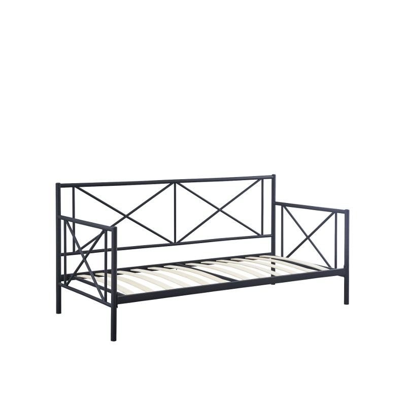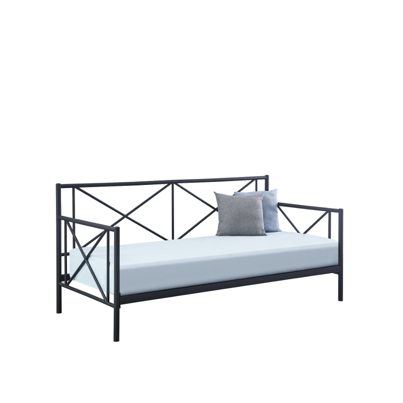 Μεταλλικό κρεβάτι μοντέρνου σχεδιασμού μαύρου χρώματος. Διαθέτει περιμετρικά μαύρα κάγκελα με τέσσερις μεταλλικές κολώνες για μεγαλύτερη ασφάλεια, και ορθοπεδικές τάβλες για μεγαλύτερη άνεση. Μπορείτε να το χρησιμοποιήσετε και σαν καναπέ. Λειτουργικό σχέδιο που αποπνέει ρομαντισμό και κομψότητα.
