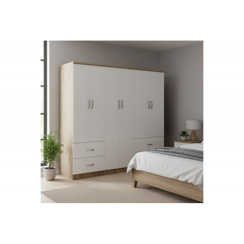 Αναβαθμίστε τον αποθηκευτικό σας χώρο με αυτή την μοντέρνα και λειτουργική ντουλάπα σε χρώμα που ταιριάζει σε κάθε διακόσμηση. Η Lego είναι η ιδανική λύση για όσους αναζητούν οργάνωση και στυλ στον χώρο τους. Τεχνικά χαρακτηριστικά: Σκελετός κατασκευασμένος από μοριοσανίδα με επένδυση μελαμίνης υψηλής ποιότητας, με αντοχή στην καταπόνηση, την φθορά και τον χρόνο. Περιλαμβάνει έξι πόρτες, εσωτερικά φέρει ράγα για κρεμάστρες και ράφια ενώ κάτω φέρει τέσσερα μεγάλα συρτάρια για την αποθήκευση ρούχων και αξεσουάρ. Αποτελείται από δύο ντουλάπες που μπορούν να στηθούν και ανεξάρτητα. Προσφέρεται σε sonoma-λευκή απόχρωση. Διάσταση προϊόντος: Μήκος: 200,5 εκ. Πλάτος: 42 εκ. Ύψος: 180 εκ.