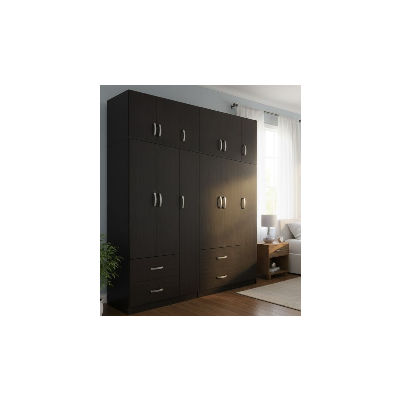 Αναβαθμίστε τον αποθηκευτικό σας χώρο με την Εξάφυλλη Ντουλάπα με Πατάρι Lego, μια λειτουργική και κομψή λύση που συνδυάζει άφθονο χώρο και σύγχρονο design. Τεχνικά χαρακτηριστικά: Σκελετός κατασκευασμένος από μοριοσανίδα με επένδυση μελαμίνης υψηλής ποιότητας, με αντοχή στην καταπόνηση, την φθορά και τον χρόνο. Μοντέρνα Αισθητική: Καθαρό, λιτό design με ομαλές επιφάνειες και διακριτικά μεταλλικά χερούλια που ταιριάζει αρμονικά σε κάθε υπνοδωμάτιο ή χώρο φιλοξενίας. Περιλαμβάνει έξι πόρτες, εσωτερικά φέρει ράγα για κρεμάστρες και ράφια ενώ κάτω φέρει τέσσερα μεγάλα συρτάρια για την αποθήκευση ρούχων και αξεσουάρ και με την προσθήκη παταριού, προσφέρει έξτρα αποθήκευση για ρούχα, λευκά είδη αλλά και εποχιακά αντικείμενα. Αποτελούνται απο δυο ντουλάπες και δυο πατάρια που μπορούν να στηθούν και ανεξάρτητα. Προσφέρεται σε wenge απόχρωση. Διάσταση προϊόντος: Μήκος: 180 εκ. Πλάτος: 42 εκ. Ύψος: 240 εκ.
