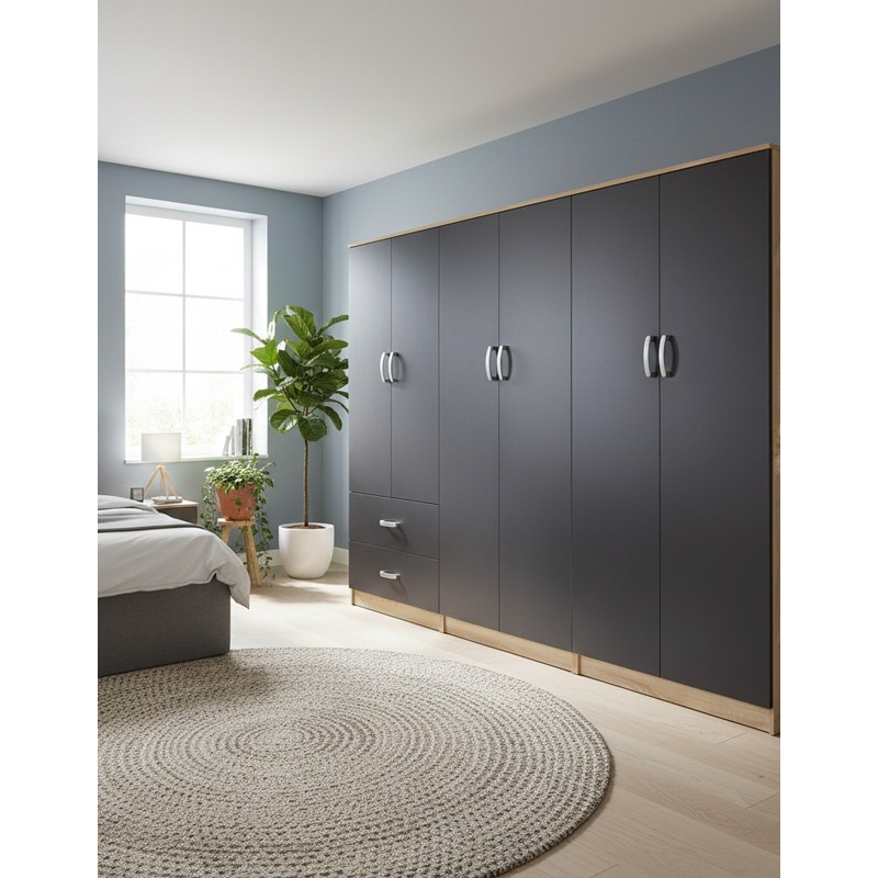 Αναβαθμίστε τον αποθηκευτικό σας χώρο με αυτή την μοντέρνα και λειτουργική ντουλάπα σε χρώμα που ταιριάζει σε κάθε διακόσμηση. Η Lego είναι η ιδανική λύση για όσους αναζητούν οργάνωση και στυλ στον χώρο τους. Τεχνικά χαρακτηριστικά: Σκελετός κατασκευασμένος από μοριοσανίδα με επένδυση μελαμίνης υψηλής ποιότητας, με αντοχή στην καταπόνηση, την φθορά και τον χρόνο. Περιλαμβάνει εξι πόρτες, εσωτερικά φέρει ράγα για κρεμάστρες ενώ κάτω φέρει δύο μεγάλα συρτάρια για την αποθήκευση ρούχων και αξεσουάρ. Αποτελείται από τρεις ντουλάπες που μπορούν να στηθούν και ανεξάρτητα. Προσφέρεται σε sonoma-ανθρακί απόχρωση. Διάσταση προϊόντος: Μήκος: 240 εκ. Πλάτος: 42 εκ. Ύψος: 180 εκ.