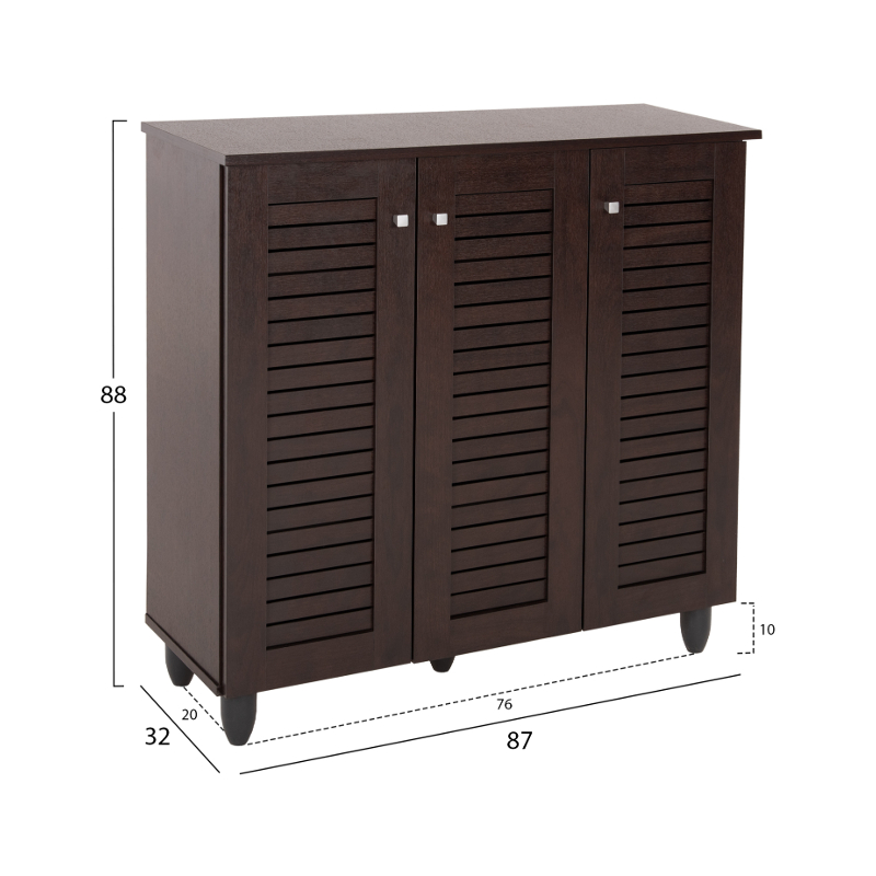 Σας παρουσιάζουμε την παπουτσοθήκη-ντουλάπι μελαμίνης PROLLY σε WENGE χρώμα. Πρόκειται για ένα ψηλό σχετικά ντουλάπι με 2 ξεχωριστούς χώρους με 3 ράφια που δημιουργούν 4 χώρους αποθήκευσης, και κλείνει με 3 πόρτες με μεταλλικά κυβάκια χερούλια. Μια διπλή πόρτα για τον μεγαλύτερο χώρο, και μια μονή πόρτα για τον μικρότερο χώρο. Σκοπός μας είναι να σας βοηθήσουμε να οργανώσετε και να βελτιώσετε με τον καλύτερο δυνατό τρόπο οτιδήποτε θελήσετε. ΤΕΧΝΙΚΑ ΧΑΡΑΚΤΗΡΙΣΤΙΚΑ: Συνολικές διαστάσεις: 87x32x88Υ εκ. Ράφια μεγάλου ντουλαπιού: Α) 56x24x17Υ εκ. Β) 56x24x17Υ εκ. Γ) 56x24x17Υ εκ. Δ) 56x30x17Υ εκ. Ράφια μικρού ντουλαπιού: Α) 27,5x24x17Υ εκ. Β) 27,5x24x17Υ εκ. Γ) 27,5x24x17Υ εκ. Δ) 27,5x30x17Υ εκ. Ύψος ποδιών: 10 εκ. Απόσταση ποδιών: 76x20 εκ. ΥΛΙΚΟ ΚΑΤΑΣΚΕΥΗΣ: Η παπουτσοθήκη- ντουλάπα είναι κατασκευασμένη εξολοκλήρου από μελαμίνη. Η μελαμίνη είναι ένα συνθετικό υλικό πολύ ανθεκτικό και με μεγάλη σκληρότητα, σε μορφή φύλλων τα οποία στην συνέχεια μετατρέπονται σε μοριοσανίδες με πρεσάρισμα. Τα χερούλια στις πόρτες είναι μεταλλικά. Τα πόδια της παπουτσοθήκης είναι από πολυαιθυλένιο για ιδιαίτερη αντοχή στο βάρος, στο νερό και φυσικά στον χρόνο. ΣΥΝΤΗΡΗΣΗ: Η ντουλάπα-παπουτσοθήκη είναι εύκολη στην συντήρησή της. Η κατασκευή της από μελαμίνη της επιτρέπει να είναι ανθεκτική στην τριβή, τις γρατσουνιές και τους λεκέδες. Κατ’επέκταση, καθαρίζεται εύκολα με ένα υγρό πανί. ΠΛΕΟΝΕΚΤΗΜΑΤΑ: Η παπουτσοθήκη είναι όμορφη και λειτουργική. Επίσης, οι πόρτες έχουν σχεδιασμό παντζουριού που επιτρέπει την κυκλοφορία του αέρα και συμβάλλει στον σωστό και αναγκαίο αερισμό της παπουτσοθήκης. Το χρώμα της και το γενικότερο design της, είναι σίγουρο ότι θα τραβήξουν τα βλέμματα και θα αναγκάσουν πολύ κόσμο να την συμπεριλάβουν στην wishlist τους. **Το προϊόν παραδίδεται αμοντάριστο σε εργοστασιακή συσκευασία