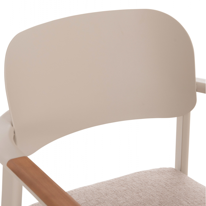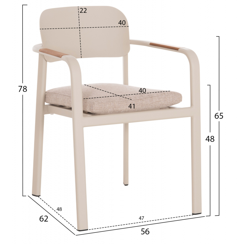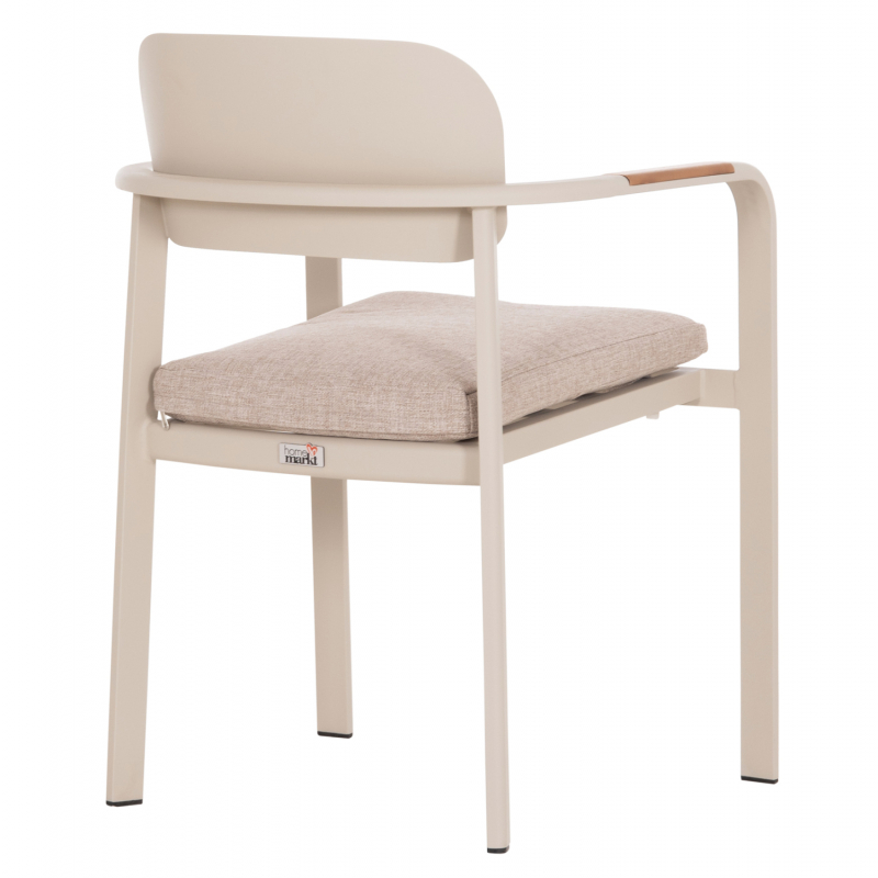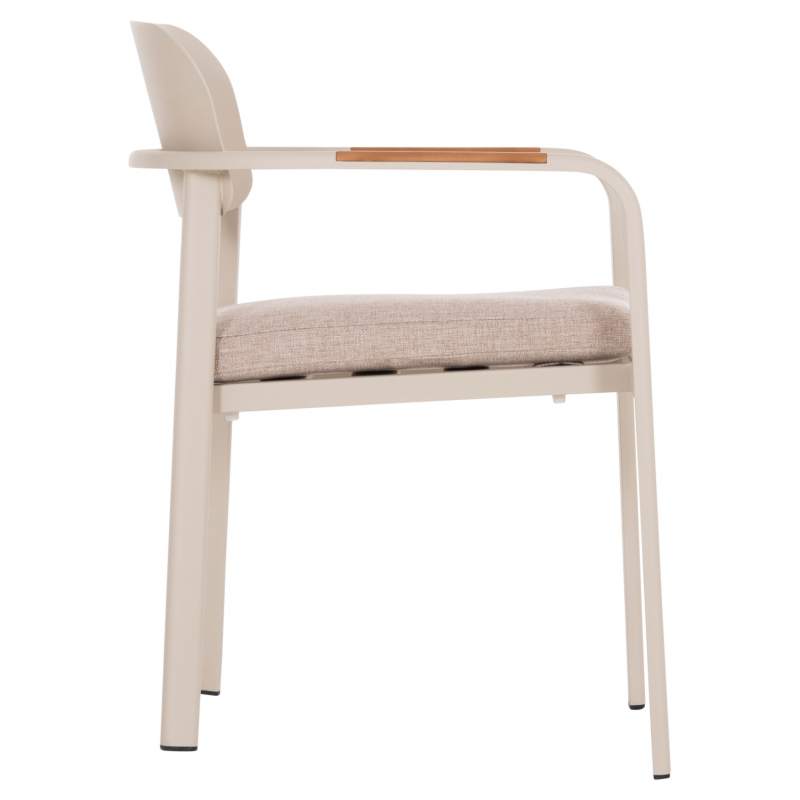ΠΟΛΥΘΡΟΝΑ ΤΡΑΠΕΖΑΡΙΑΣ ELARA Η πολυθρόνα εξωτερικού χώρου ELARA συνδυάζει μοντέρνα αισθητική, ανθεκτικά υλικά και πρακτική λειτουργικότητα. Ο σκελετός από αλουμίνιο σε ΜΠΕΖ χρώμα προσφέρει υψηλή αντοχή στις εξωτερικές συνθήκες, ενώ τα διακοσμητικά τελειώματα από ξύλο teak στα μπράτσα προσθέτουν φυσική και ζεστή πινελιά. Το μαξιλάρι καθίσματος διαθέτει κάλυμμα OLEFIN σε ΜΠΕΖ χρώμα και αφρό 25D για άνεση κατά τη χρήση. Στοιβαζόμενη για εύκολη αποθήκευση. ΔΙΑΣΤΑΣΕΙΣ 56x62x78Υ εκ. Ύψος καθίσματος: 48 εκ. Ύψος μπράτσων: 65 εκ. Διαστάσεις καθίσματος: 40x41 εκ. Διαστάσεις πλάτης: 40x22 εκ. Απόσταση ποδιών: 47x48 εκ. ________________________________________ ΥΛΙΚΑ • Σκελετός αλουμινίου μπεζ με προδιαγραφές ποδιών 40x18x1.2mm. • Πλάτη από αλουμίνιο για μέγιστη αντοχή και σταθερότητα. • Μαξιλάρι καθίσματος πάχους 3 εκ. με αφρό πυκνότητας 25D. • Κάλυμμα μαξιλαριού από ύφασμα OLEFIN, κατάλληλο για εξωτερικούς χώρους. • Διακοσμητικά τελειώματα από φυσικό ξύλο teak στα μπράτσα. ________________________________________ ΣΥΝΤΗΡΗΣΗ • Καθαρισμός μεταλλικού σκελετού με νωπό πανί και ήπιο καθαριστικό. • Το ύφασμα OLEFIN καθαρίζεται εύκολα με σαπουνόνερο. • Το ξύλο teak μπορεί να συντηρηθεί προαιρετικά με ειδικό λάδι μια φορά τον χρόνο. • Συνίσταται αποθήκευση ή κάλυψη κατά τους χειμερινούς μήνες για μέγιστη διάρκεια ζωής. ________________________________________ ΠΛΕΟΝΕΚΤΗΜΑΤΑ • Στοιβαζόμενη για εξοικονόμηση χώρου στην αποθήκευση. • Μοντέρνος σχεδιασμός με απαλή χρωματική παλέτα. • Ιδανική για οικιακή χρήση, επαγγελματικούς χώρους, καφετέριες και ξενοδοχεία.