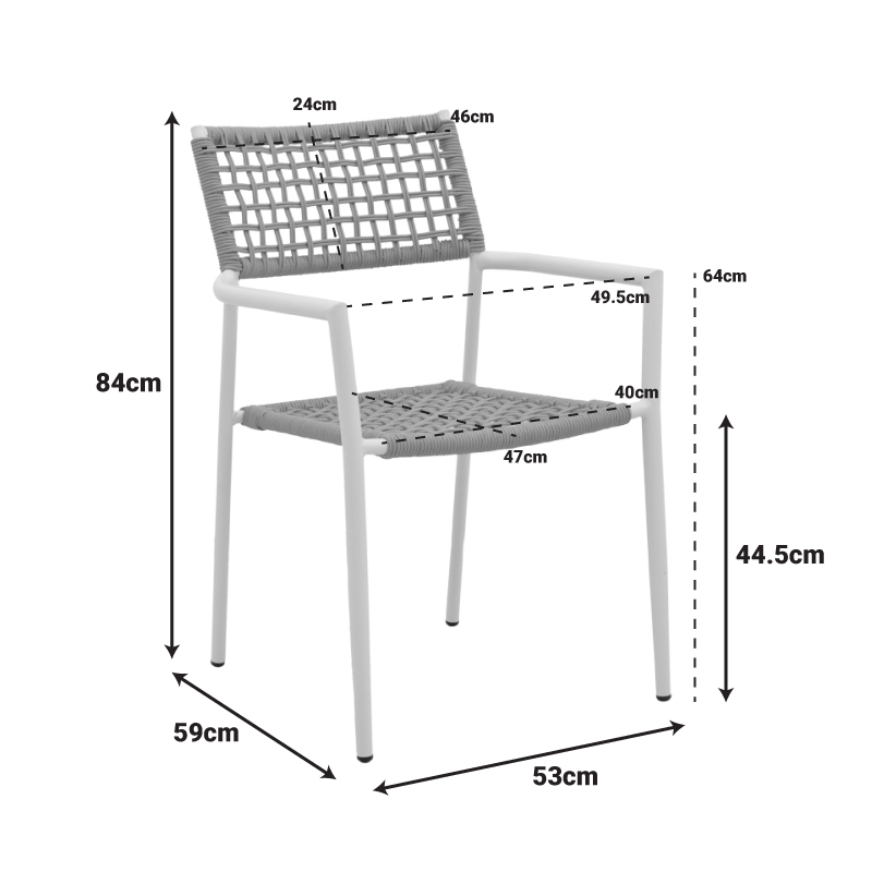 Αποκτήστε τη κομψότητα και το στυλ που χρειάζεστε για τον χώρο σας με την πολυθρόνα Castal. Κατασκευασμένη για να αντέχει, η πολυθρόνα αυτή συνδυάζει την ατσάλινη στιβαρότητα με ένα μοντέρνο, κομψό design, αποτελώντας την ιδανική επιλογή για κάθε απαιτητικό περιβάλλον. Ιδανική για: Επαγγελματικούς χώρους, βεράντες, κήπους, και κάθε σημείο που απαιτεί συνδυασμό υψηλής αντοχής και design. Τεχνικά χαρακτηριστικά: Ασύγκριτη Αντοχή: Ο σκελετός από υψηλής ποιότητας ατσάλι (O22x1.1mm) εγγυάται μέγιστη σταθερότητα και μακροζωία. Είναι κατασκευασμένη για να αντέχει στην έντονη χρήση και τις δύσκολες συνθήκες. Μοντέρνα Αισθητική: Η πλέξη από ανθεκτικό σχοινί (O5mm) προσδίδει μια σύγχρονη, ανάλαφρη υφή, δημιουργώντας ένα οπτικά εντυπωσιακό αποτέλεσμα που ξεχωρίζει. Εξαιρετική Προστασία: Η επιφάνεια έχει υποστεί ειδική επεξεργασία ψεκασμού, προσφέροντας ισχυρή προστασία από τη σκουριά, τις γρατζουνιές και τις καιρικές συνθήκες, ιδανική για εξωτερική χρήση. Λειτουργική & Πρακτική: Η δυνατότητα στοίβαξης (stacking) την καθιστά την τέλεια λύση για εστιατόρια, καφετέριες, μπαρ ή για το σπίτι όπου η εξοικονόμηση χώρου είναι προτεραιότητα. Διατίθεται σε μαύρο χρώμα κα ισχοινί σε φυσική απόχρωση. Διάσταση: Μήκος: 53 εκ. Πλάτος: 59 εκ. Ύψος: 84 εκ. Μήκος έδρας: 40 εκ. Βάθος έδρας: 47 εκ. Ύψος μπράτσου: 64 εκ. Ύψος έδρας: 44.5 εκ.