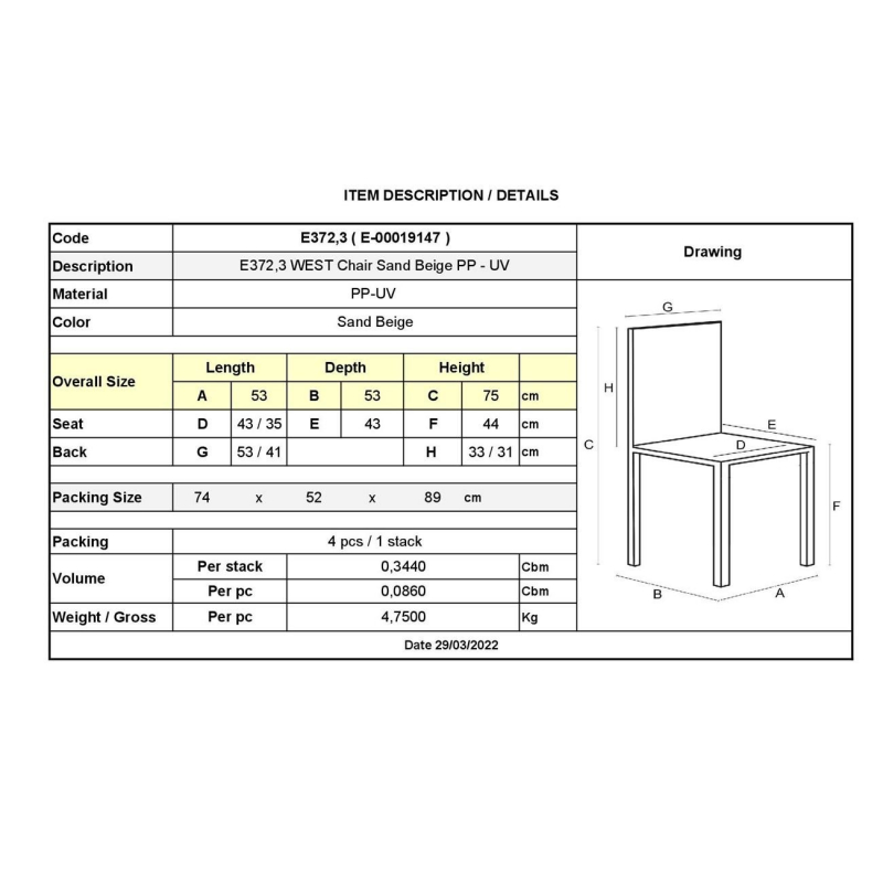 Ε372,3 WEST Καρέκλα PP-UV Sand Beige