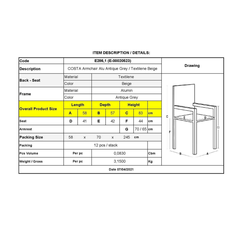 COSTA Πολυθρόνα Dining Αλουμινίου, Απόχρωση Antique Grey - Textilene Μπεζ 58x57x83cm