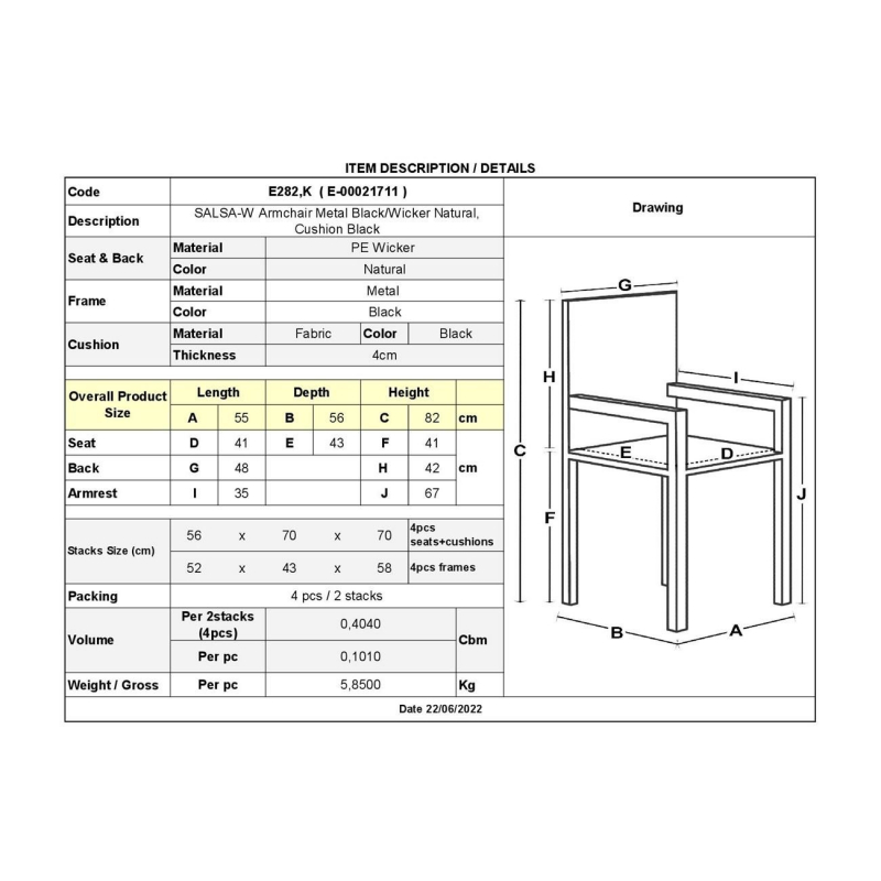SALSA-W Πολυθρόνα Τραπεζαρίας Κήπου, Μέταλλο Βαφή Μαύρο, Wicker Φυσικό, Μαξιλάρι Μαύρο 55x56x82cm
