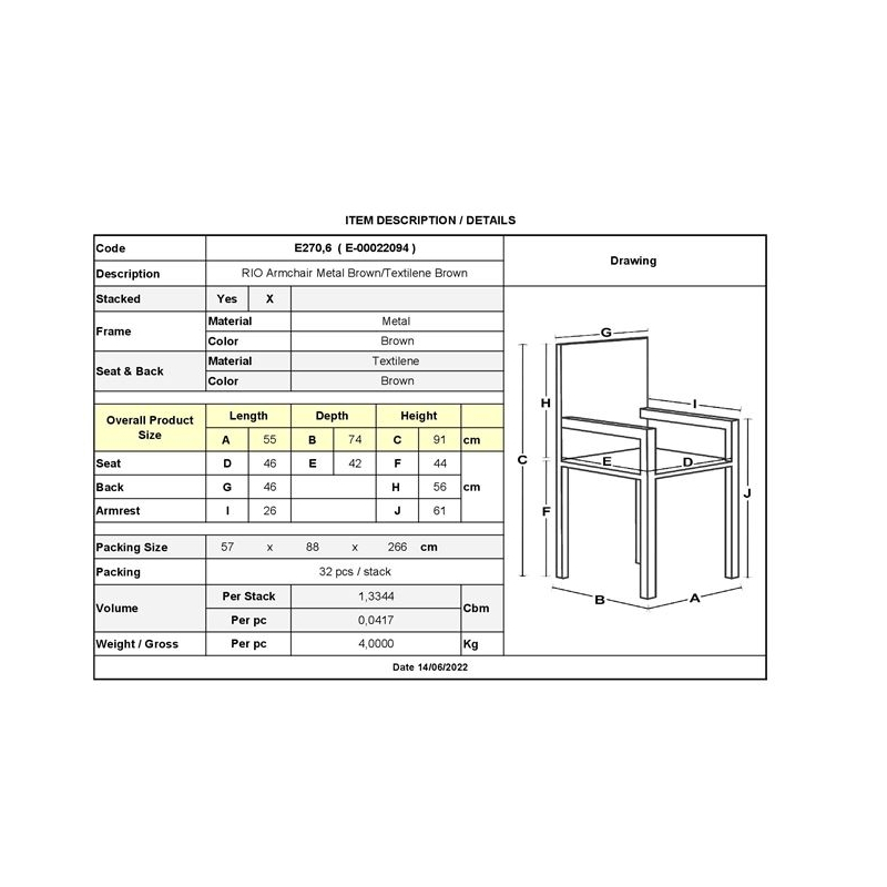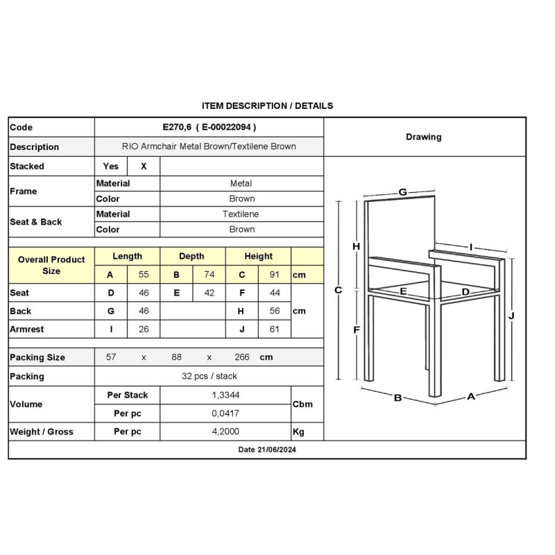 RIO Πολυθρόνα Στοιβαζόμενη Κήπου, Μέταλλο Βαφή Καφέ, Τextilene Καφέ (4,20kg) 55x74x91cm
