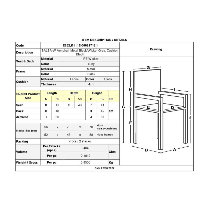 Ε282,Κ1 SALSA-W Πολυθρ.Μέταλ.Μαύρο/Wicker Γκρι, Μαξ.Μαύρο