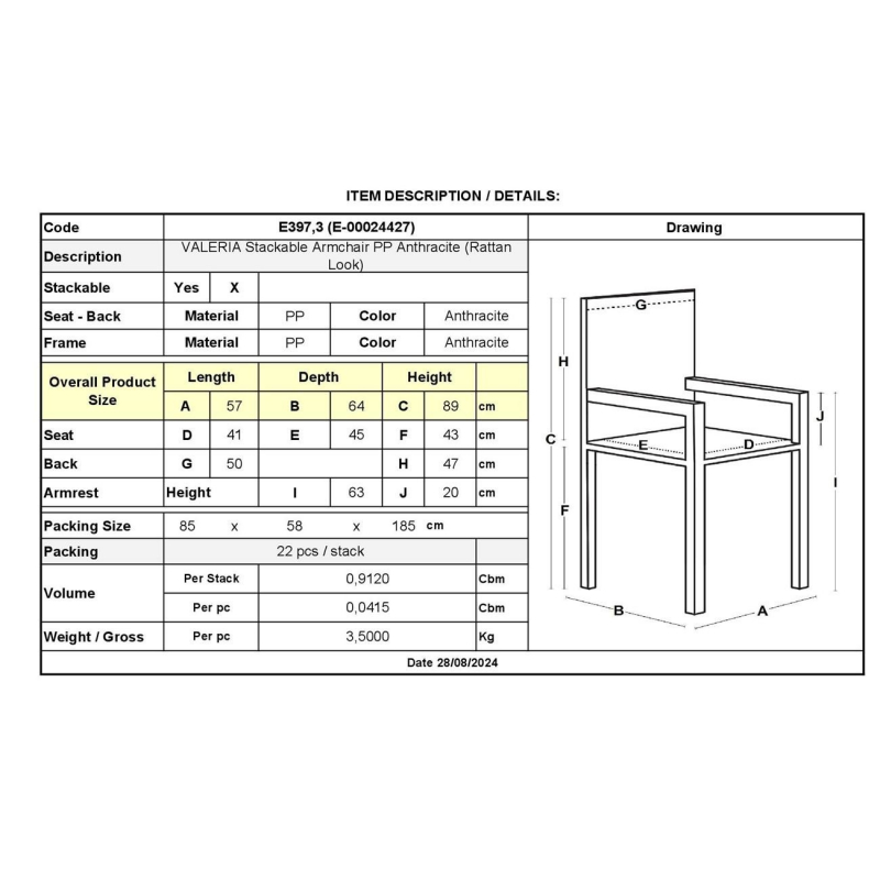 Ε397,3 VALERIA Πολυθρόνα PP Ανθρακί (Rattan Look) Στοιβαζόμενη
