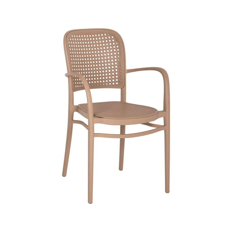 Η πολυθρόνα ΗΜ5938.03 έχει όλα όσα θα θέλατε από ένα τέτοιο έπιπλο. Είναι ποιοτική και κομψή στην όψη, και σίγουρα τραβάει τα βλέμματα. Όλη η πολυθρόνα είναι από μονοκόμματο πολυπροπυλένιο σε καπουτσίνο χρώμα με ελαφρώς κυρτή πλάτη και πρακτικά μπράτσα. Το κάθισμα αλλά και η πλάτη είναι σε στυλ «ψάθας» πολυπροπυλενίου. Η πολυθρόνα είναι στοιβαζόμενη, ελαφριά και άνετη, και θα γίνει το αγαπημένο κάθισμα σε όποιο χώρο κι αν τοποθετηθεί χάρη στην πρακτικότητά του. Ιδανική επιλογή και για επαγγελματική χρήση, όπως σε catering κτλ. ΤΕΧΝΙΚΑ ΧΑΡΑΚΤΗΡΙΣΤΙΚΑ: Διαστάσεις: 55x53x86Υ εκ. Ύψος καθίσματος: 47 εκ. Ύψος μπράτσων: 67 εκ. Διαστάσεις καθίσματος: 46x41 εκ. Διάσταση πλάτης: 39x42 εκ. Απόσταση ποδιών: 54x46 εκ. ΥΛΙΚΑ ΚΑΤΑΣΚΕΥΗΣ: Ολόκληρη η πολυθρόνα είναι κατασκευασμένη από ενισχυμένο πολυπροπυλένιο. Το πολυπροπυλένιο είναι ιδιαίτερα ανθεκτικό στο βάρος και στο νερό, ενώ έχει μεγάλη αντοχή σε θερμοκρασίες έως και 125 βαθμούς Κελσίου. Επίσης, η ανθεκτικότητά του δεν περιορίζεται στο βάρος, στο νερό και στην θερμοκρασία αλλά είναι ασυνήθιστα ανθεκτικό σε πολλά χημικά διαλυτικά, οξέα, και βάσεις. ΣΥΝΤΗΡΗΣΗ: Τα έπιπλα πολυπροπυλενίου καθαρίζονται πανεύκολα με ένα βρεγμένο πανί. Εάν μάλιστα βρίσκονται σε εξωτερικό χώρο, μπορούν να καθαριστούν απευθείας με τρεχούμενο νερό.
