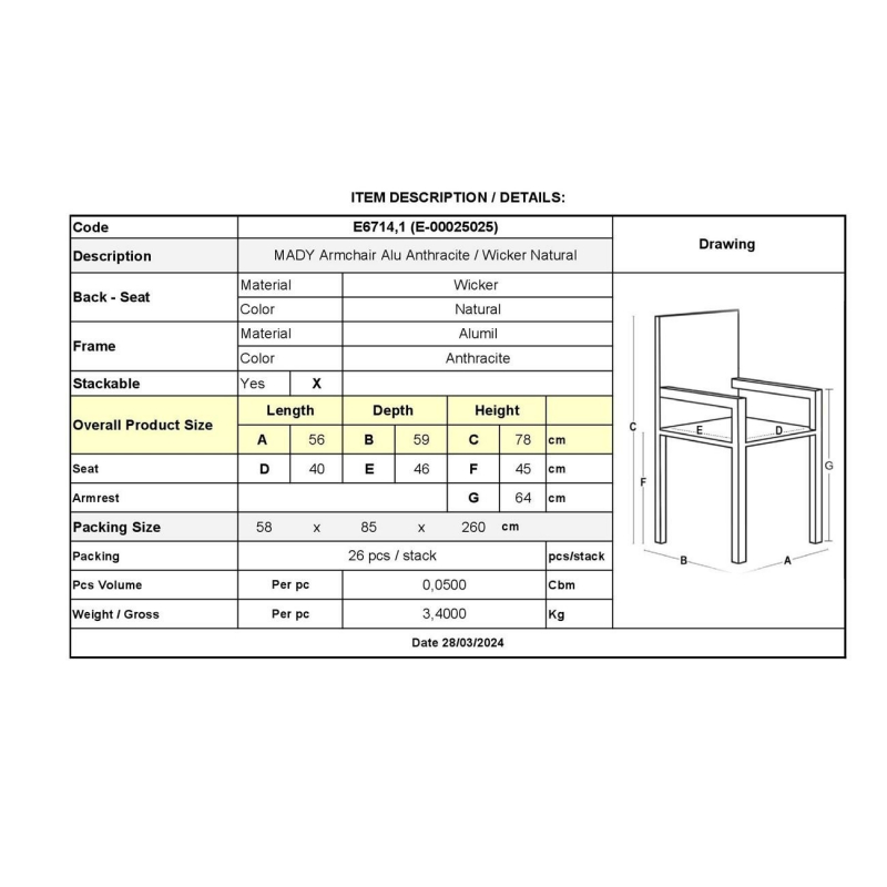 MADY Πολυθρόνα Βεράντας-Κήπου ALU Ανθρακί, Rope Wicker Φυσικό, Στοιβαζόμενη 56x59x78cm