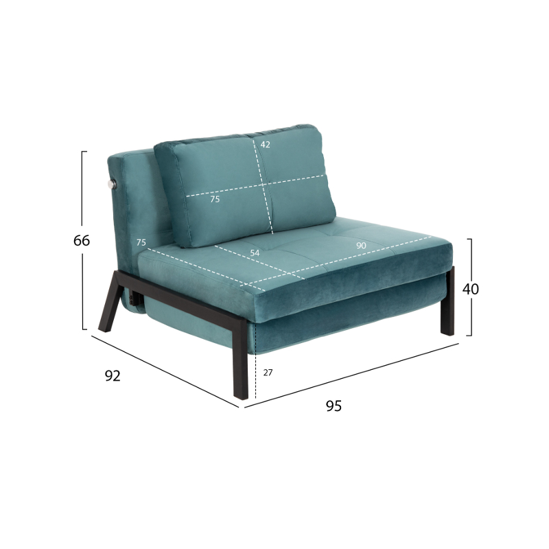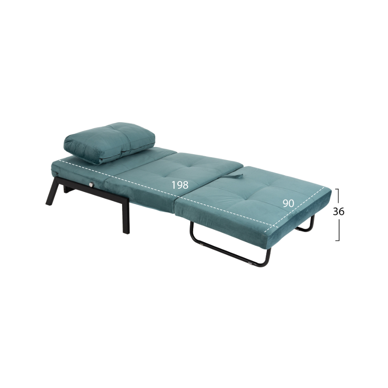 Η πολυθρόνα-κρεβάτι CONSTANCE είναι η επιτομή της πρακτικότητας και του όμορφου στυλ. Στηρίζεται σε μεταλλικά μαύρα πόδια, ενώ όλη η επένδυσή της έχει γίνει με βελούδινο ύφασμα σε χρώμα ΒΕΡΑΜΑΝ δημιουργώντας μια πανέμορφη διχρωμία. Το στοιχείο που την κάνει να ξεχωρίζει είναι ότι με μια απλή κίνηση μπορεί να μετατραπεί σε κρεβάτι προσφέροντας μια ποιοτική λύση για απρόσμενες διανυκτερεύσεις, ή ακόμα και ως δεύτερο κρεβάτι σε σπίτια με περιορισμένο χώρο. ΔΙΑΣΤΑΣΕΙΣ: 95x92x66Υ εκ. Ύψος καθίσματος: 40 εκ. Διαστάσεις καθίσματος: 90x54-75 εκ. Απόσταση ποδιών: 95x92 εκ. Ύψος ποδιών: 27 εκ. Κρεβάτι: 90x198x36 εκ. Μαξιλάρι: 75x42 εκ. Πάχος μαξιλαριού: 18 εκ. ΥΛΙΚΑ ΚΑΤΑΣΚΕΥΗΣ: Ολόκληρη η επένδυση της πολυθρόνας έχει γίνει με υψηλής ποιότητας βελούδινο ύφασμα. Το βελούδο είναι το ύφασμα που δεν μπορεί να αφήσει κανέναν ασυγκίνητο! Είτε καλύπτει μικρές είτε μεγάλες επιφάνειες, δεν μπορεί παρά να κάνει την παρουσία του αισθητή στο χώρο και να μαγνητίσει τα βλέμματα. Πρόκειται για ένα ύφασμα απαλό, χαλαρό, απολαυστικό και φινετσάτο που είναι αδύνατον να του αντισταθεί κάποιος. Το θετικό είναι ότι μπορεί να εναρμονιστεί εύκολα με κάθε είδος διακόσμησης, προσδίδοντας στο χώρο φινέτσα και καλαισθησία. Τα πόδια είναι μεταλλικά, πράγμα που προσφέρει στιβαρότητα και σταθερότητα. ΣΥΝΤΗΡΗΣΗ: Χάρη στα ανθεκτικά υλικά κατασκευής, η πολυθρόνα είναι φιλική προς τον χρήστη. Για να διατηρήσετε καθαρό και αφράτο το βελούδο, καλό είναι να το καθαρίζετε μία φορά την εβδομάδα με την ηλεκτρική σκούπα. Τοποθετήστε ένα απαλό βουρτσάκι, βάλτε το ήπιο πρόγραμμα στη σκούπα σας και σκουπίστε όλη την επιφάνεια με τη φορά της ίνας. Θα δείτε ότι αμέσως η σκόνη θα απομακρυνθεί και το πέλος του υφάσματος θα γίνει σαν καινούργιο. Σε καμία περίπτωση δεν πρέπει να τρίψετε ένα βελούδινο ύφασμα. Ακόμα και αν πρέπει να αφαιρέσετε έναν λεκέ μην τον τρίψετε. Βρέξτε ένα απαλό πανάκι με νερό και ταμπονάρετε τοπικά στον λεκέ. Ιδανική επιλογή για το καθάρισμα των βελούδων αποτελεί και το δέρμα (δηλαδή τα πανάκια μ