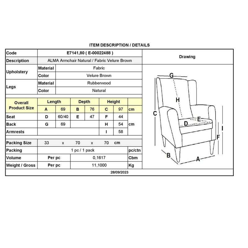 Ε7141,80 ALMA Πολυθρόνα Φυσικό/Ύφασμα Velure Καφέ (K/D)