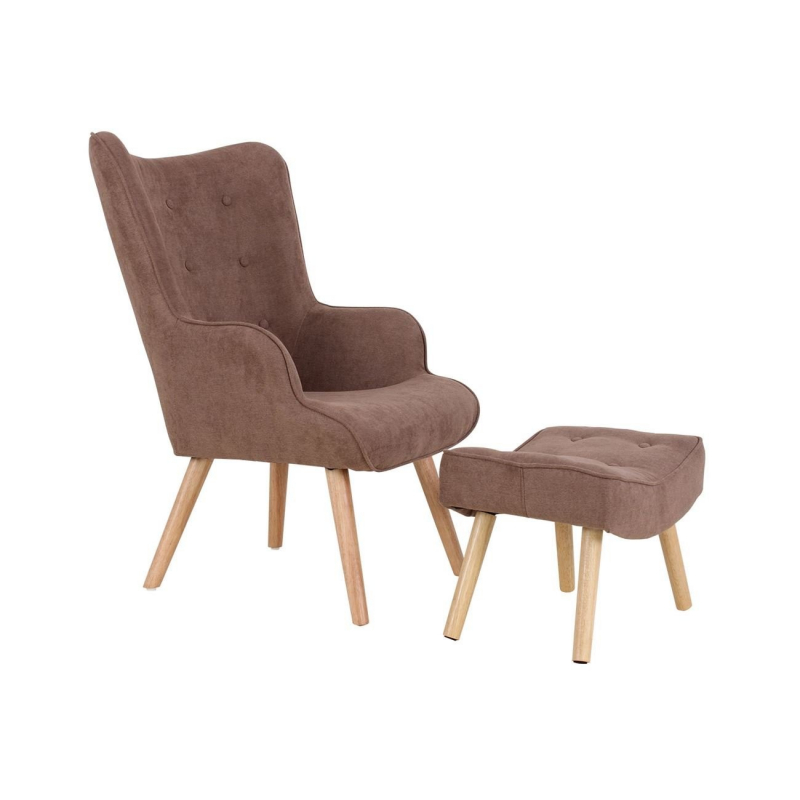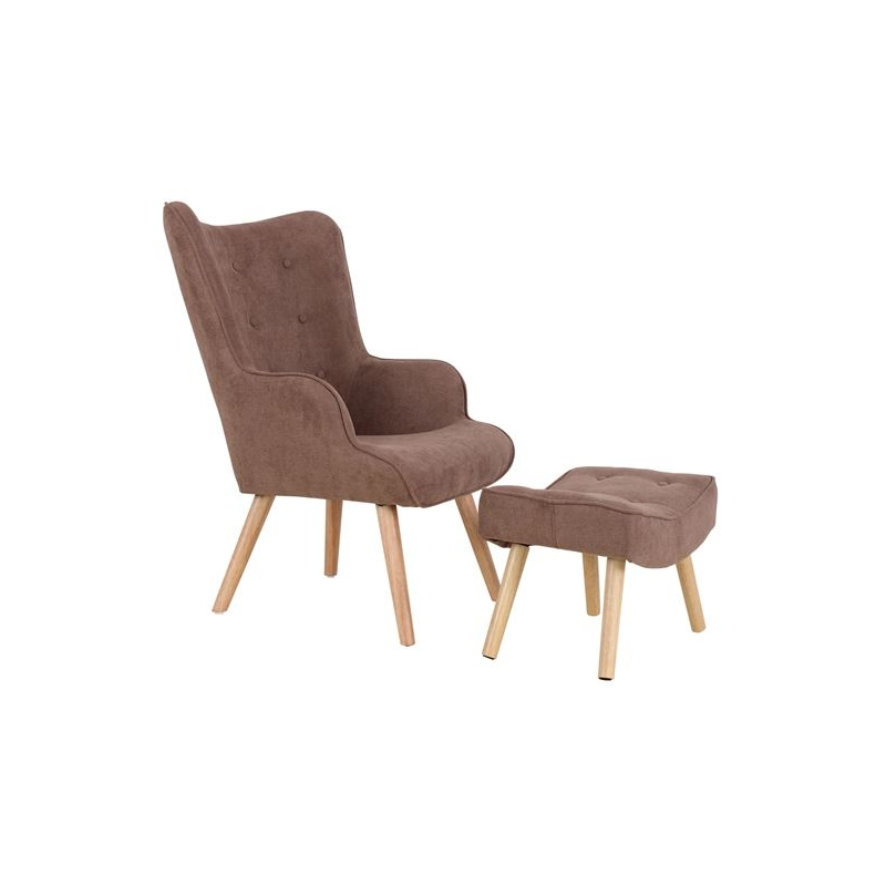 MARON BUTTON Set: Πολυθρόνα Μπερζέρα + Σκαμπό, Ξύλο Φυσικό Ύφασμα Σκούρο Καφέ 69x76x97 + 52x38x35cm