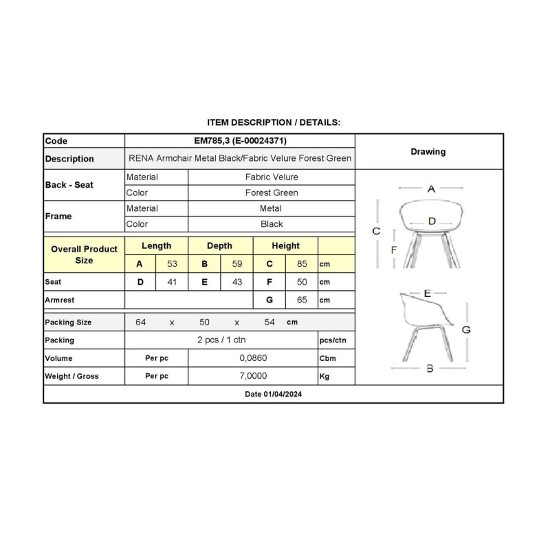 ΕΜ785,3 RENA Πολυθρόνα Μεταλ.Μαύρο/Ύφασμα Velure Forest Green