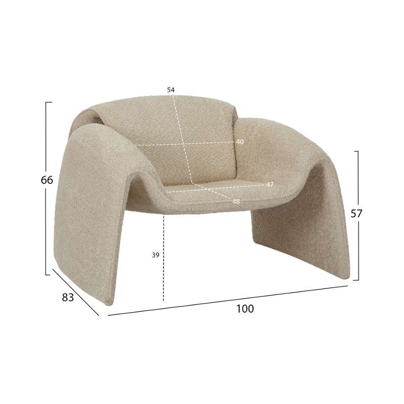 Η πολυθρόνα εσωτερικού χώρου LAFORGE σε ΜΠΕΖ χρώμα είναι μοντέρνα και πανέμορφη. Το χαρακτηριστικό που κάνει αυτή την πολυθρόνα να ξεχωρίζει είναι οι φουτουριστικές καμπύλες του μεταλλικού σκελετού που σχηματίζουν την αναπαυτική πλάτη με τα μπράτσα, ενώ όλη η κατασκευή δίνει την εντύπωση ότι αιωρείται στον χώρο. Μια πολυθρόνα που είναι σίγουρο ότι θα μαγνητίσει το ενδιαφέρον όλων. ΔΙΑΣΤΑΣΕΙΣ: 100x83x66Υ εκ. Ύψος καθίσματος: 39 εκ. Ύψος μπράτσων: 57 εκ. Διαστάσεις καθίσματος: 47x48 εκ. Διάσταση πλάτης: 54x40 εκ. ΥΛΙΚΑ ΚΑΤΑΣΚΕΥΗΣ: Ο σκελετός της πολυθρόνας είναι μεταλλικός με ηλεκτροστατική βαφή, ενώ ολόκληρη η επένδυση έχει γίνει με ανάγλυφο ύφασμα εξαιρετικής ποιότητας και υφής. ΣΥΝΤΗΡΗΣΗ: Ένα ξεσκόνισμα είναι αρκετό για να διατηρήσετε την πολυθρόνα καθαρή. Σε περίπτωση λεκέδων, χρησιμοποιήστε κάποιο ήπιο απορρυπαντικό και καθαρίστε ελαφρά με ένα πανάκι. ΠΛΕΟΝΕΚΤΗΜΑΤΑ: •Στιβαρή μεταλλική κατασκευή •Όμορφο και μοντέρνο design •Σχέση ποιότητας-τιμής •Ετοιμοπαράδοτη