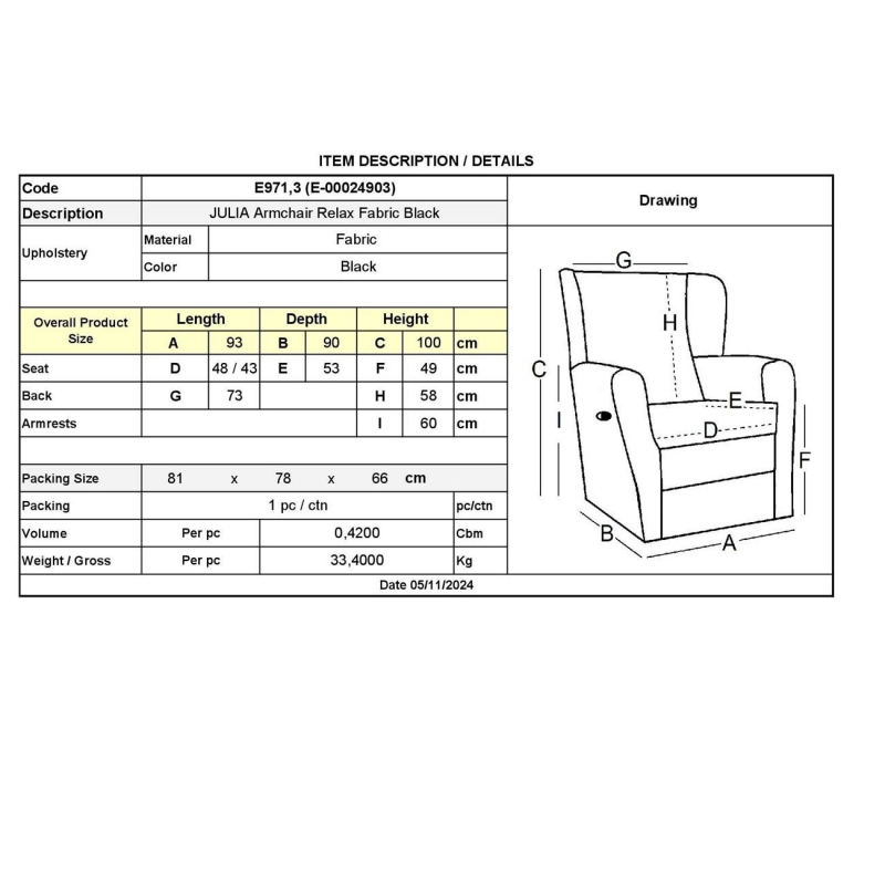 Ε971,3 JULIA Πολυθρόνα Relax Ύφασμα Μαύρο