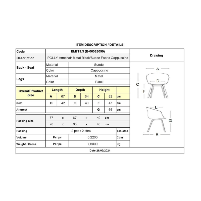 ΕΜ719,3 POLLY Πολυθρόνα Μεταλ.Μαύρο/Ύφασμα Suede Cappuccino