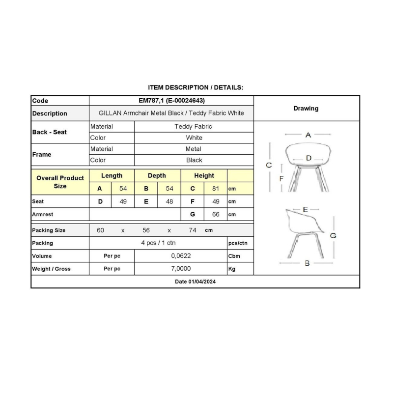ΕΜ787,1 GILLAN Πολυθρόνα Μεταλ.Μαύρο/Teddy Ύφ.Άσπρο
