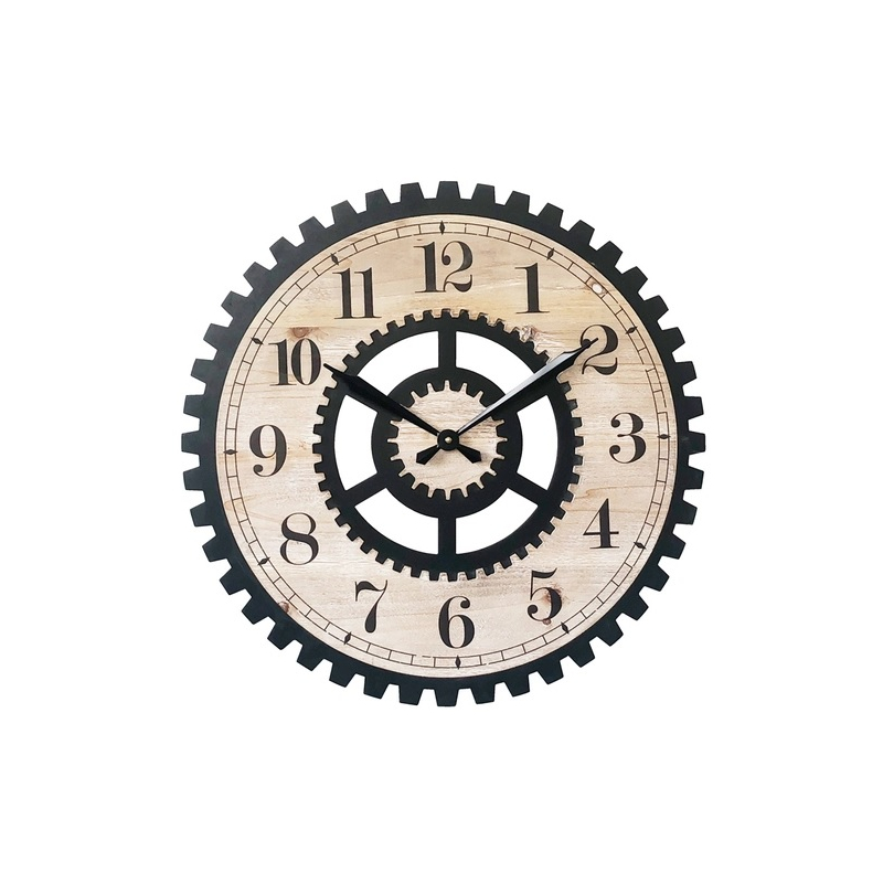Ρολόι τοίχου στρογγυλό από ξύλο σε σχήμα και σχέδιο γραναζιού σε μαύρες και φυσικές αποχρώσεις.