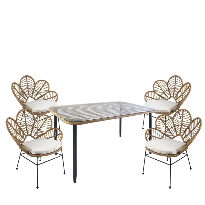 Σετ τραπεζαρία κήπου ANNIUS φυσικό/μαύρο μέταλλο/rattan/γυαλί με 4 καρέκλες.