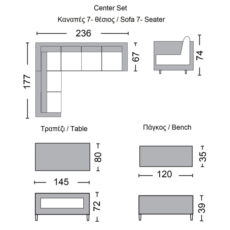 Ε6852 CENTER Set Steel (Τραπ+3θ+3θ Γων+Πάγκ) Wicker Γκρι/Μαξ.Σκ.Γκρι