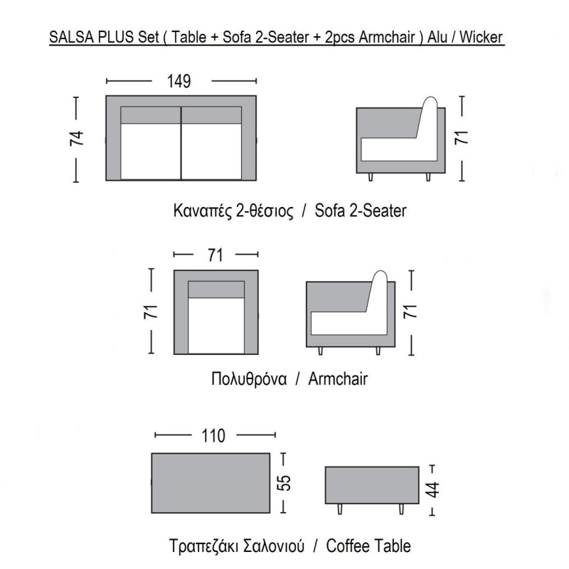 SALSA Plus Set Σαλόνι Κήπου ALU Μαύρο-Γυαλί-Wicker Φυσικό: Τραπέζι+2 Θέσιος+2 Πολυθρόνες 110x55x44-149x74x71-71x71x71cm