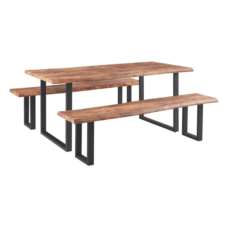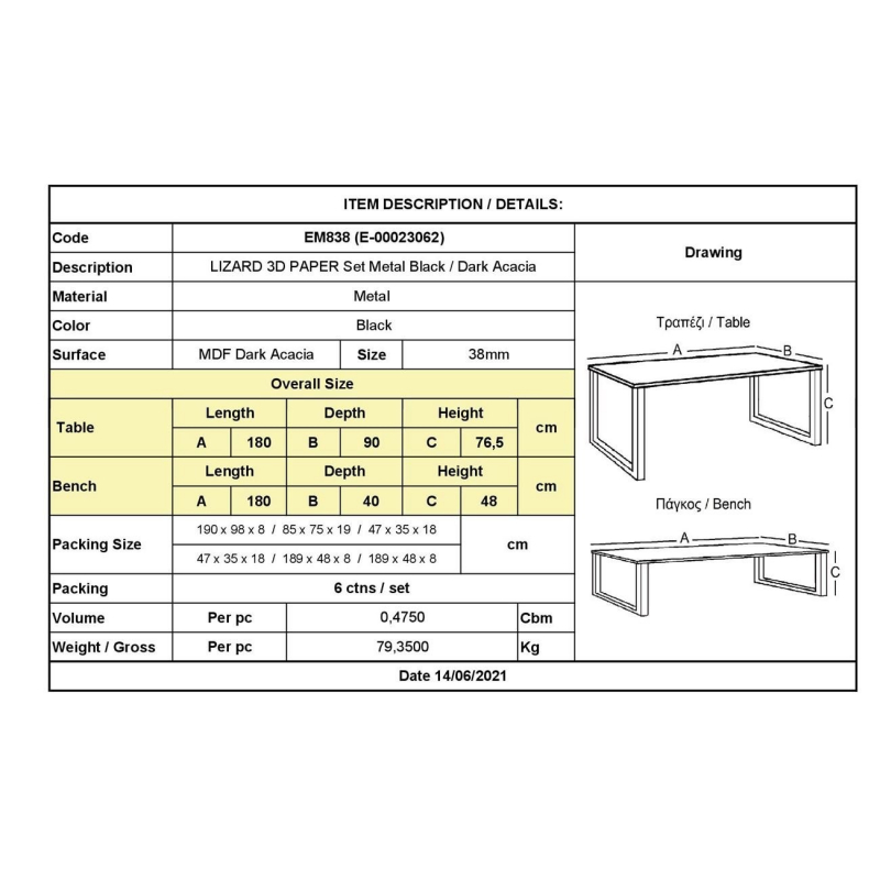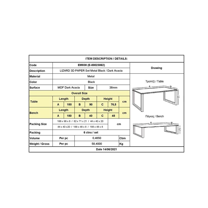 LIZARD 3D PAPER Set: Τραπέζι 180x90cm + 2 Πάγκοι Μέταλλο Βαφή Μαύρο, Dark Acacia Table180x90x77 Bench:180x40x47