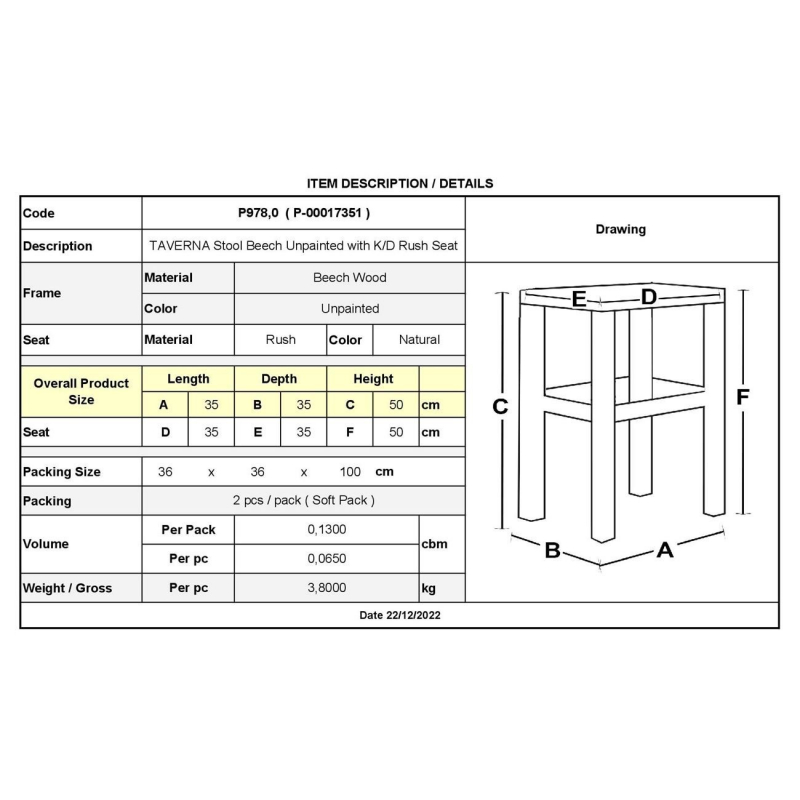 ΤΑΒΕΡΝΑΣ Σκαμπό Βοηθητικό, Οξιά Άβαφο με Κάθισμα Ψάθα - Αβίδωτη 35x35x50cm