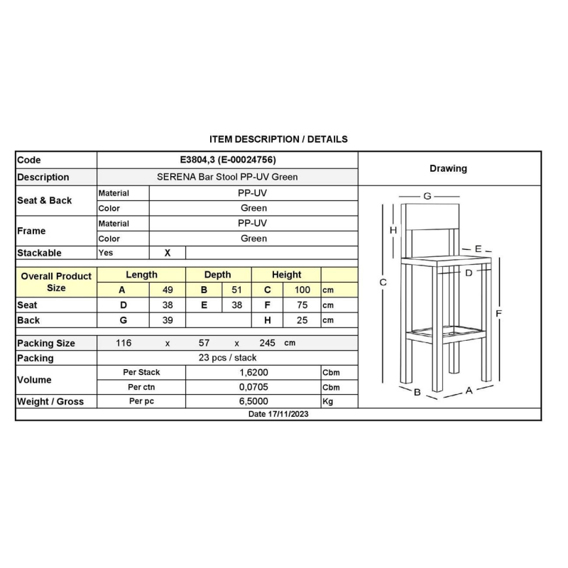Ε3804,3 SERENA Σκαμπό Bar PP-UV Πράσινο - Στοιβαζόμενο