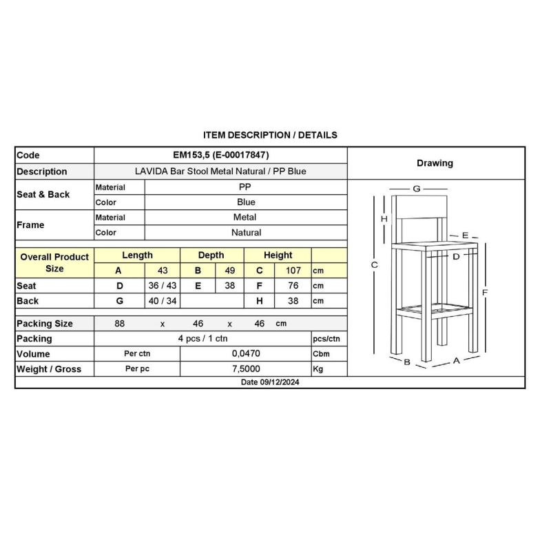 ΕΜ153,5 LAVIDA Σκαμπό Bar Μεταλλικό Φυσικό, PP Μπλε