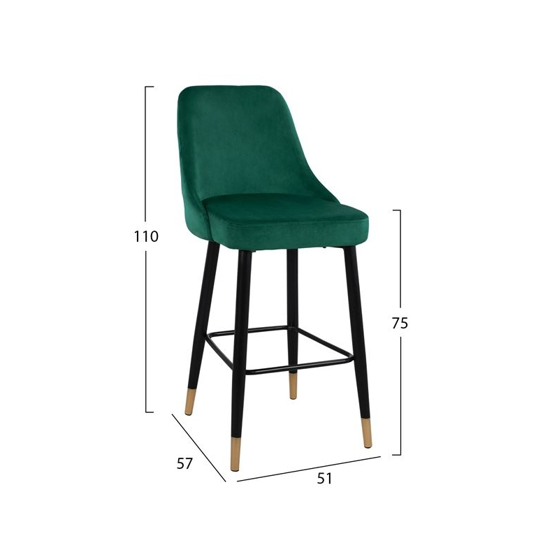Το σκαμπό SERENITY είναι επενδυμένο με ύφασμα βελούδο σε κυπαρισσί απόχρωση με μεταλλικό σκελετό σε μαύρη ματ απόχρωση και χρυσές λεπτομερείς. Η πλάτη του σκαμπό είναι επενδεδυμένη με υπέροχο καπιτονέ σχέδιο. Επιλέξτε μοντέρνα σκαμπό που δίνουν στο χώρο σας μια διαφορετική νότα. Ένα άγγιγμα κομψότητας, σε συνδυασμό με αμέτρητες χρωματικές παραλλαγές και σχήματα. Το ελαφρώς λαμπερό ύφασμα με την αδιαμφισβήτητη εμφάνιση και αίσθηση δεν είναι χωρίς λόγο μια από τις ζωντανές τάσεις κατ 'εξοχήν. Η βελούδινη κάλυψη κάνει τη διαφορά! Διαστάσεις: 51x57x110 εκ. Ύψος καθίσματος: 75 εκ. Διαστάσεις καθίσματος: 48x45 εκ.