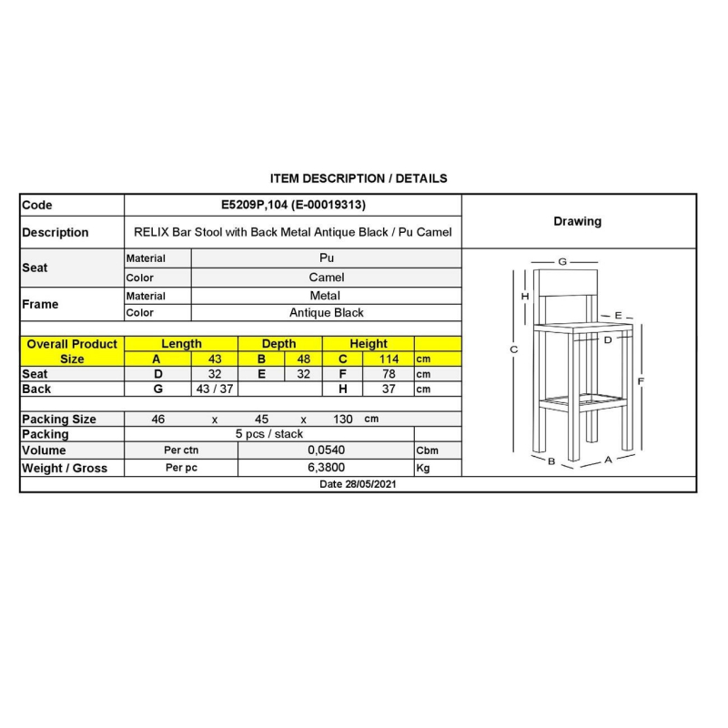 Ε5209P,104 RELIX Σκαμπό Bar-Pro Με Πλάτη Antique Black/Pu Camel