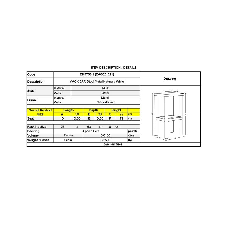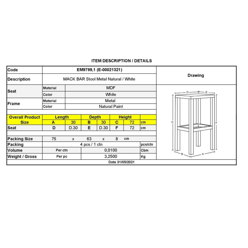 ΕΜ9799,1 MACK Σκαμπό BAR Μεταλ.Φυσικό/Άσπρο