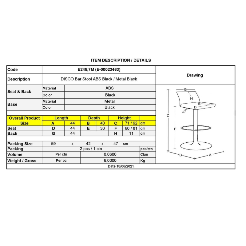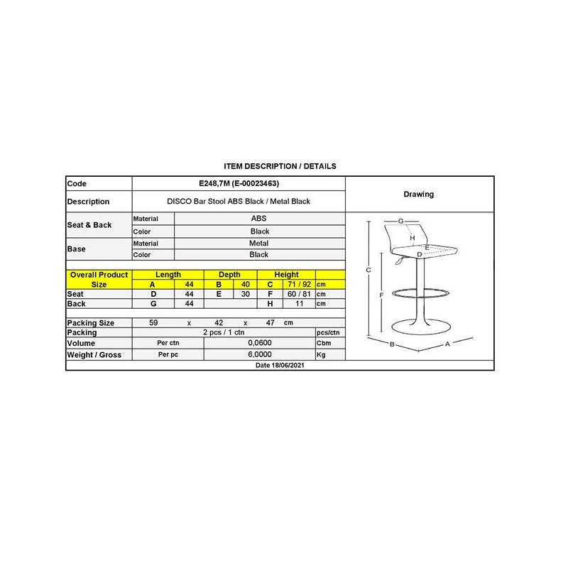 Ε248,7Μ DISCO Σκαμπό Bar Μέταλλο Βαφή Μαύρο/ABS Μαύρο