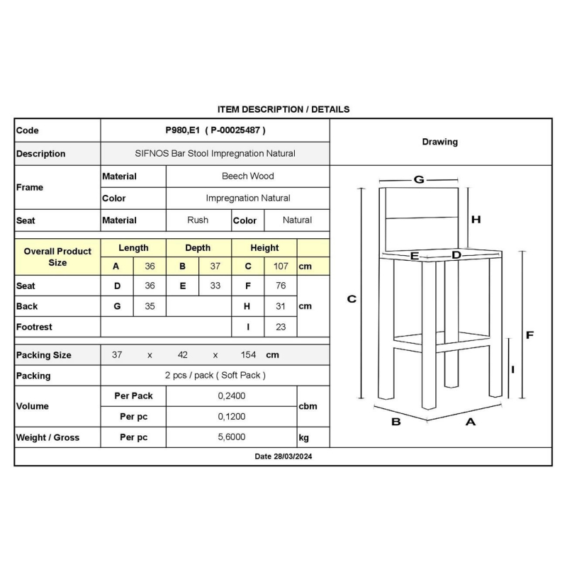 Ρ980,Ε1 ΣΙΦΝΟΣ Σκαμπό BAR 42R Ψάθα Εμποτ.Φυσικό