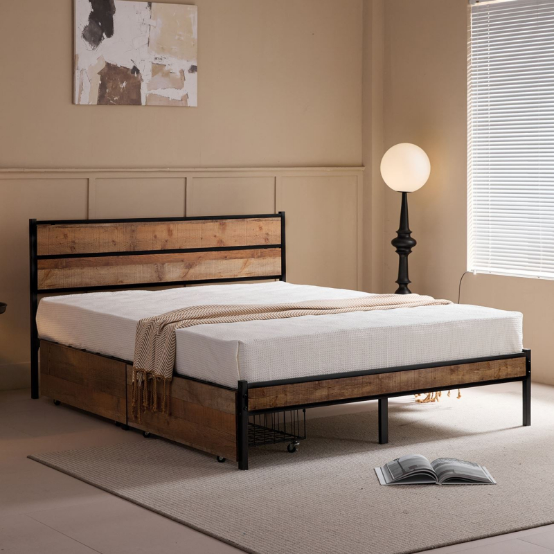 PALLET Κρεβάτι Διπλό-Συρτάρια, για Στρώμα 160x200cm, Μέταλλο Βαφή Μαύρο, Antique Oak