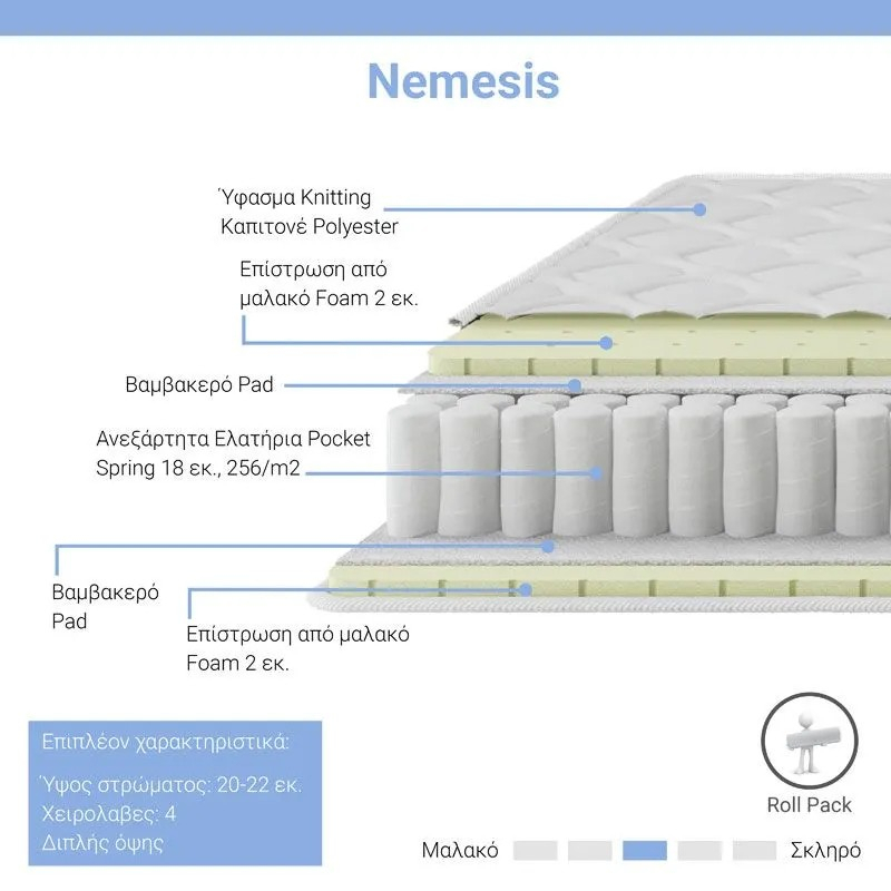 Εάν ψάχνετε ένα στρώμα ποιότητας με ελατήρια, εύκολο στην μεταφορά (Roll Pack) και στην καλύτερη τιμή της αγοράς, τότε το Nemesis είναι η καλύτερη επιλογή για έναν ξεκούραστο ύπνο.