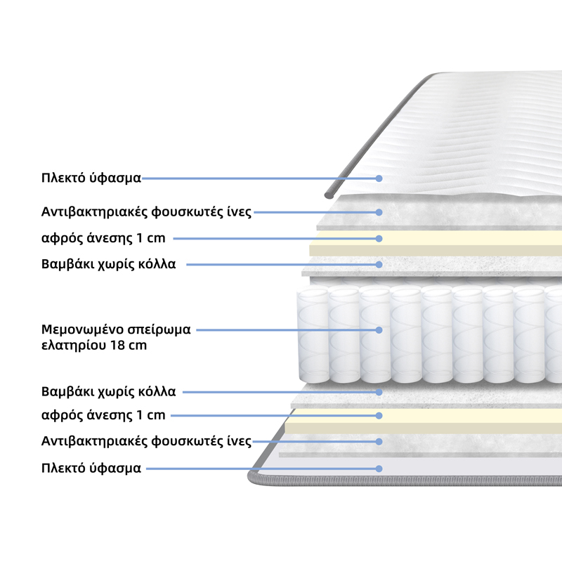 Στρώμα Dreamer – Pocket Spring με Αντιβακτηριδιακή Προστασία Αναβαθμίστε τον ύπνο σας με το στρώμα Dreamer, που συνδυάζει εργονομία, υγιεινή και απόλυτη άνεση. Σχεδιασμένο με κορυφαία υλικά και σύγχρονη τεχνολογία, προσφέρει ιδανική στήριξη στη σπονδυλική στήλη και αίσθηση φρεσκάδας σε κάθε στιγμή της ξεκούρασής σας. Τεχνικά Χαρακτηριστικά: Pocket Spring 18εκ: Πυρήνας στήριξης από ανεξάρτητα ελατήρια ύψους 18cm, κατασκευασμένα από ατσάλινο σύρμα 1.8mm. Διαθέτει επιπλέον ενίσχυση με δύο εξωτερικούς πυλώνες 2.2mm για αυξημένη σταθερότητα. Εξασφαλίζει ελάχιστη μεταφορά κίνησης ώστε να μην ενοχλείστε από τις κινήσεις του/της συντρόφου σας. Αντιβακτηριδιακές ίνες & αφρός άνεσης: Προσθέτουν αίσθηση απαλότητας, υγιεινής και ανθεκτικότητας. Διπλής όψης: Μπορεί να χρησιμοποιηθεί και από τις δύο πλευρές, για μεγαλύτερη διάρκεια ζωής. Κατασκευή χωρίς κόλλα: Οικολογικός σχεδιασμός, ασφαλέστερος για εσάς και το περιβάλλον. Compressed Pack: Συσκευασμένο σε κενό αέρος και συμπιεσμένο για εύκολη και πρακτική μεταφορά. Χρώμα: Λευκό με γκρι λεπτομέρειες. Διαστάσεις: Μήκος: 90 εκ Πλάτος: 190 εκ Ύψος: 20 εκ Παρατηρήσεις Το προϊόν παραδίδεται σε εργοστασιακή συσκευασία (compressed). Αρκεί να το αποσυσκευάσετε και να το αφήσετε λίγες ώρες ώστε να επανέλθει στο κανονικό του μέγεθος. Ενδέχεται να υπάρχει μικρή απόκλιση στην απόχρωση του προϊόντος σε σχέση με την απεικόνιση στην οθόνη σας. Το στρώμα Dreamer είναι η ιδανική επιλογή για όσους αναζητούν έναν συνδυασμό ορθής στήριξης και απαλής άνεσης, εξασφαλίζοντας ποιοτικό και αναζωογονητικό ύπνο κάθε βράδυ.