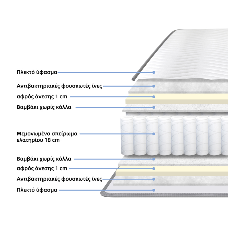 Στρώμα Dreamer – Pocket Spring με Αντιβακτηριδιακή Προστασία Αναβαθμίστε τον ύπνο σας με το στρώμα Dreamer, που συνδυάζει εργονομία, υγιεινή και απόλυτη άνεση. Σχεδιασμένο με κορυφαία υλικά και σύγχρονη τεχνολογία, προσφέρει ιδανική στήριξη στη σπονδυλική στήλη και αίσθηση φρεσκάδας σε κάθε στιγμή της ξεκούρασής σας. Τεχνικά Χαρακτηριστικά: Pocket Spring 18εκ: Πυρήνας στήριξης από ανεξάρτητα ελατήρια ύψους 18cm, κατασκευασμένα από ατσάλινο σύρμα 1.8mm. Διαθέτει επιπλέον ενίσχυση με δύο εξωτερικούς πυλώνες 2.2mm για αυξημένη σταθερότητα. Εξασφαλίζει ελάχιστη μεταφορά κίνησης ώστε να μην ενοχλείστε από τις κινήσεις του/της συντρόφου σας. Αντιβακτηριδιακές ίνες & αφρός άνεσης: Προσθέτουν αίσθηση απαλότητας, υγιεινής και ανθεκτικότητας. Διπλής όψης: Μπορεί να χρησιμοποιηθεί και από τις δύο πλευρές, για μεγαλύτερη διάρκεια ζωής. Κατασκευή χωρίς κόλλα: Οικολογικός σχεδιασμός, ασφαλέστερος για εσάς και το περιβάλλον. Compressed Pack: Συσκευασμένο σε κενό αέρος και συμπιεσμένο για εύκολη και πρακτική μεταφορά. Χρώμα: Λευκό με γκρι λεπτομέρειες. Διαστάσεις: Μήκος: 160 εκ Πλάτος: 200 εκ Ύψος: 20 εκ Παρατηρήσεις Το προϊόν παραδίδεται σε εργοστασιακή συσκευασία (compressed). Αρκεί να το αποσυσκευάσετε και να το αφήσετε λίγες ώρες ώστε να επανέλθει στο κανονικό του μέγεθος. Ενδέχεται να υπάρχει μικρή απόκλιση στην απόχρωση του προϊόντος σε σχέση με την απεικόνιση στην οθόνη σας. Το στρώμα Dreamer είναι η ιδανική επιλογή για όσους αναζητούν έναν συνδυασμό ορθής στήριξης και απαλής άνεσης, εξασφαλίζοντας ποιοτικό και αναζωογονητικό ύπνο κάθε βράδυ.