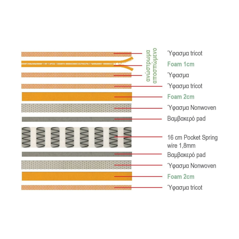 Έχει ελατήρια από ατσάλι, το καθένα μέσα σε υφασμάτινη θήκη,