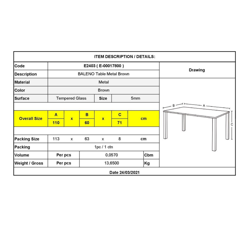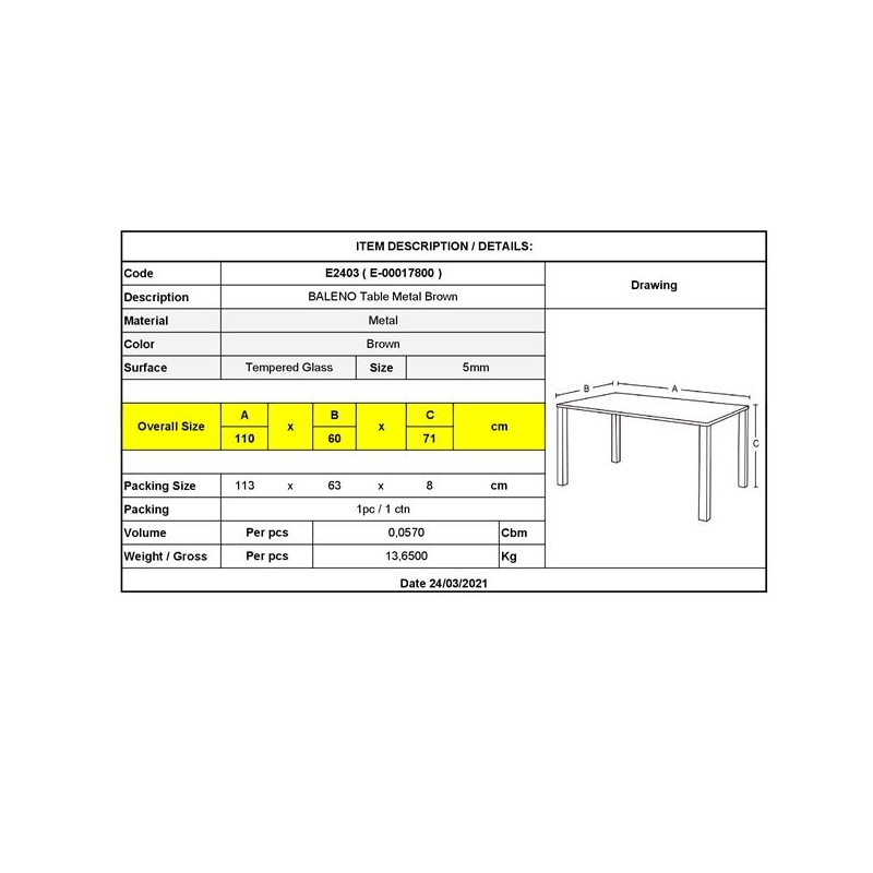 Ε2403 BALENO Τραπέζι 110x60cm Μέταλλο Καφέ/Γυαλί