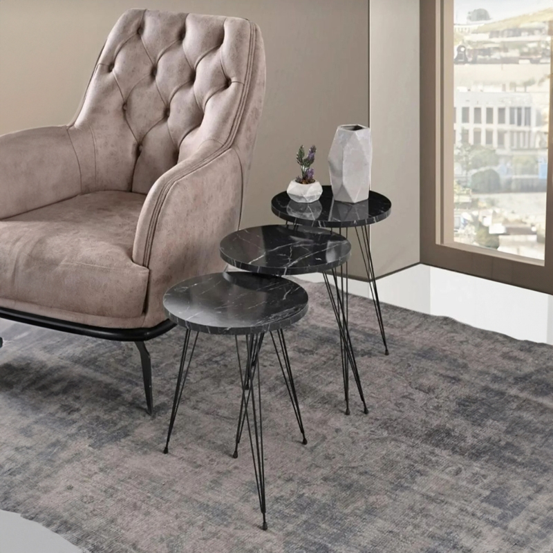 Βοηθητικά τραπέζια Wakmi pakoworld σετ 3τεμ μαύρο μαρμάρου μελαμίνης-μαύρο μέταλλο