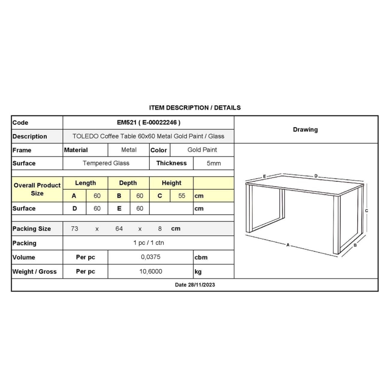ΕΜ521 TOLEDO Τραπ.Σαλονιού 60x60cm Μέταλλο Βαφή Χρυσό/Γυαλί