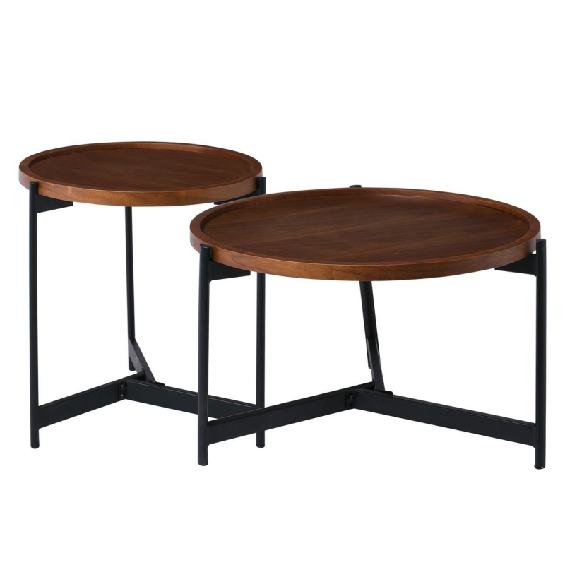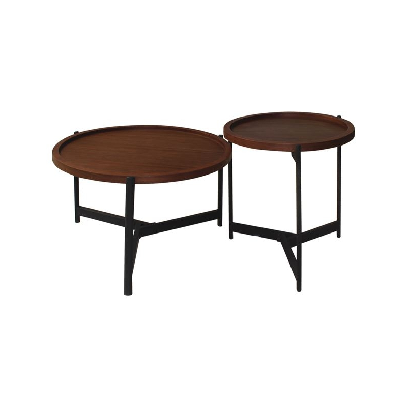 TOSS Set-2 Τραπεζάκια Σαλονιού, Καθιστικού Μέταλλο Βαφή Μαύρο, Απόχρωση Καρυδί Φ 50 H.54cm + Φ 70 H.40cm