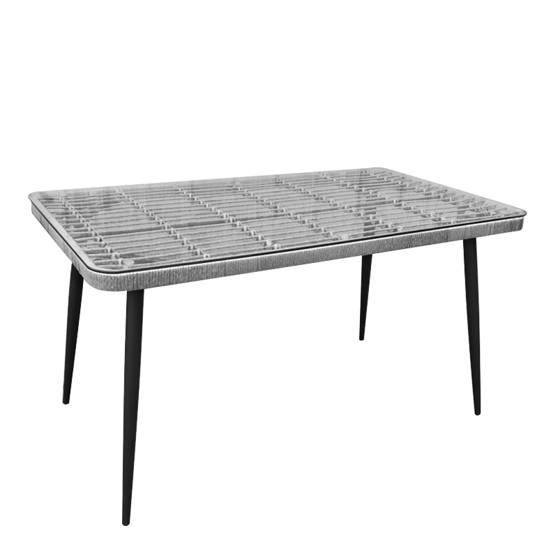 Τραπέζι κήπου ορθογώνιο κατασκευασμένο από ανθεκτικό μεταλλικό σκελετό με μεγάλα στιβαρά πόδια εξαιρετικής σταθερότητας και στιβαρότητας. Η επιφάνειά του είναι από υψηλής ποιότητας rattan και wicker, ενώ συμπληρώνεται από γυάλινη επιφάνεια για μεγαλύτερη αντοχή στην καθημερινή χρήση και για να προσφέρει μια επίπεδη επιφάνεια όπου θα μπορείτε να τοποθετείτε με ευκολία τον απογευματινό γεύμα ή καφέ σας.