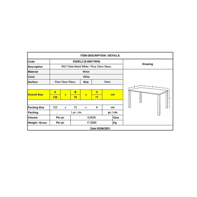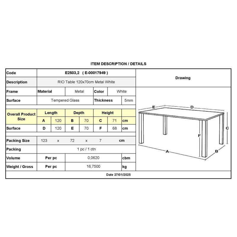 Ε2503,2 - RIO Τραπέζι 120x70cm Μεταλλικό Άσπρο/Γυαλί
