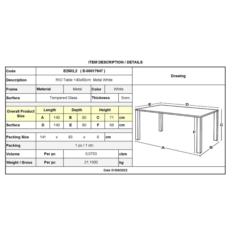 Ε2502,2 - RIO Τραπέζι 140x80cm Μεταλλικό Άσπρο/Γυαλί